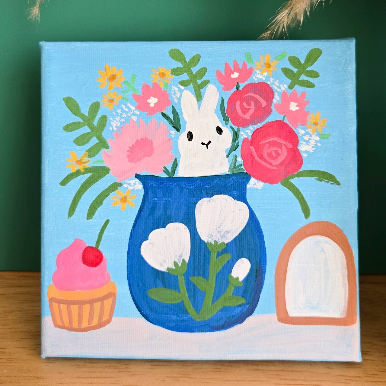 春のお花とおしゃれポットのうさぎさん【手描きキャンバスアート/1点もの】