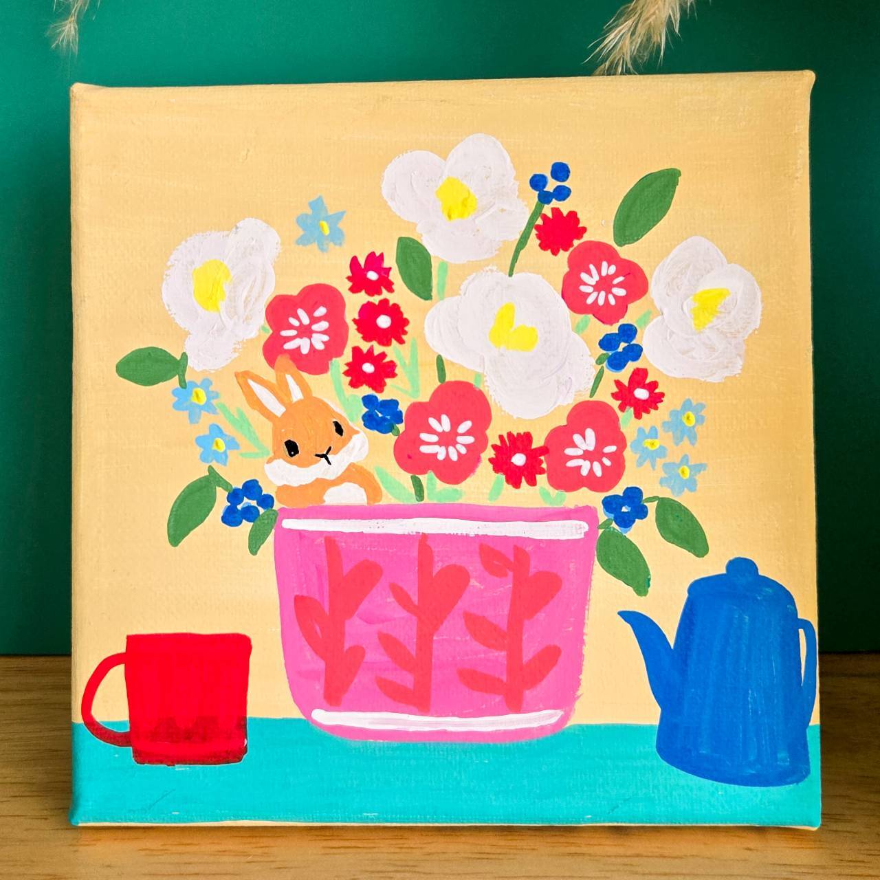 華やかなお花とくつろぐうさぎさん【手描きキャンバスアート/1点もの】