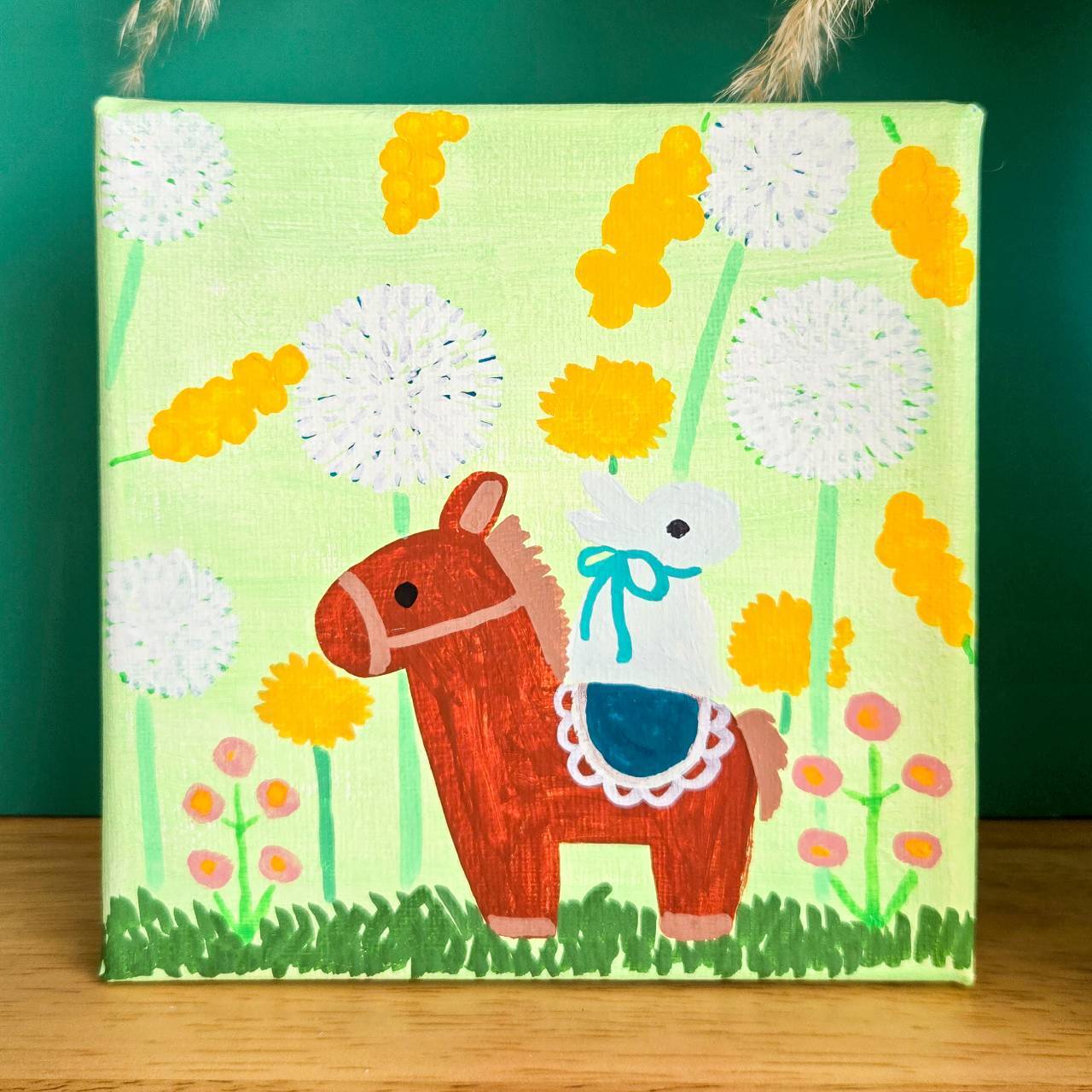 お馬さんと花散歩するうさぎさん【手描きキャンバスアート/1点もの】