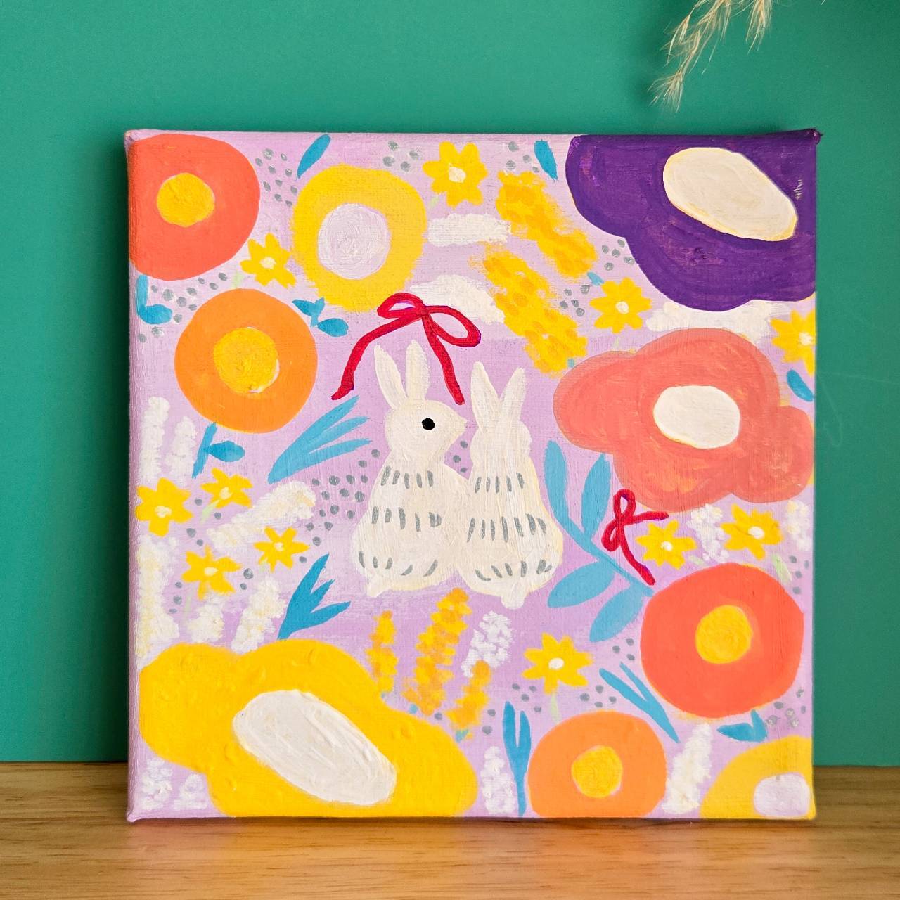 お花いっぱいの広場で仲良く過ごすうさぎさん【手描きキャンバスアート/1点もの】